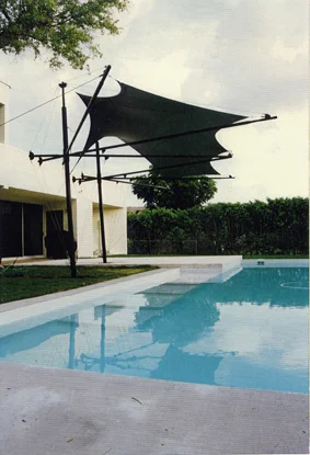 This innovative shading device over the pool and patio area of a suburban home won an award from a textile industry publication. The home itself displays Bauhaus influences.